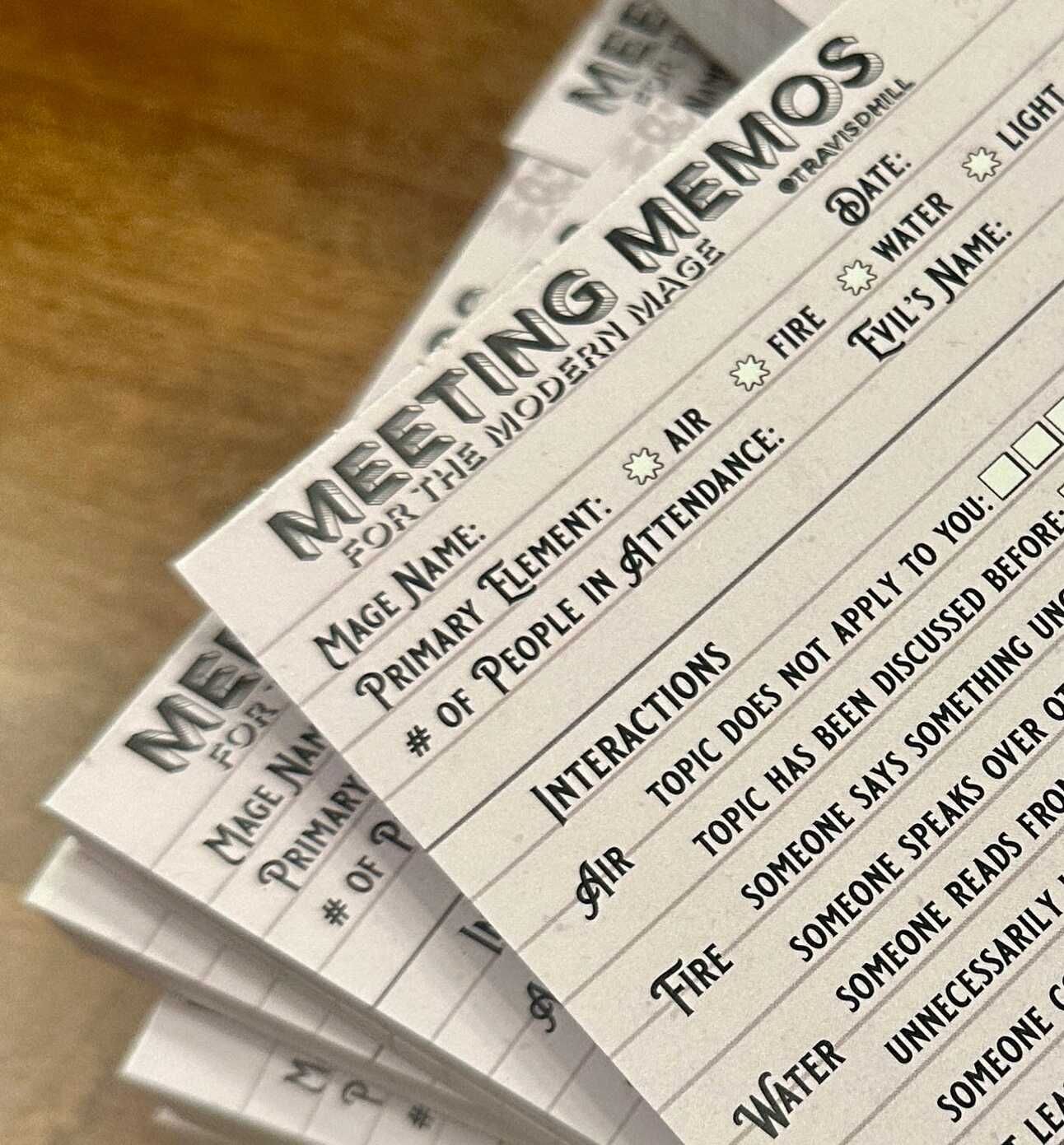I recently wrapped up Meeting Memos for the Modern Mage: a solo RPG you play during a meeting. It was a lot of fun, but all of those boxes are out of my house finally. I have a few extra if you want to grab one or two.