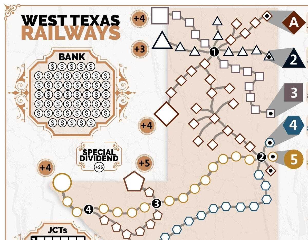 West Texas Railways is a 1-6 player print and play game! You use some cards to take some actions like lay track, purchase shares, etc. There are some junctions to shake things up a bit. The fun part? At the end of the game, you count all track from each railroad like usual, but you do so across all players who built track. Shares work the same way, meaning this could scale in all sorts of weird ways!